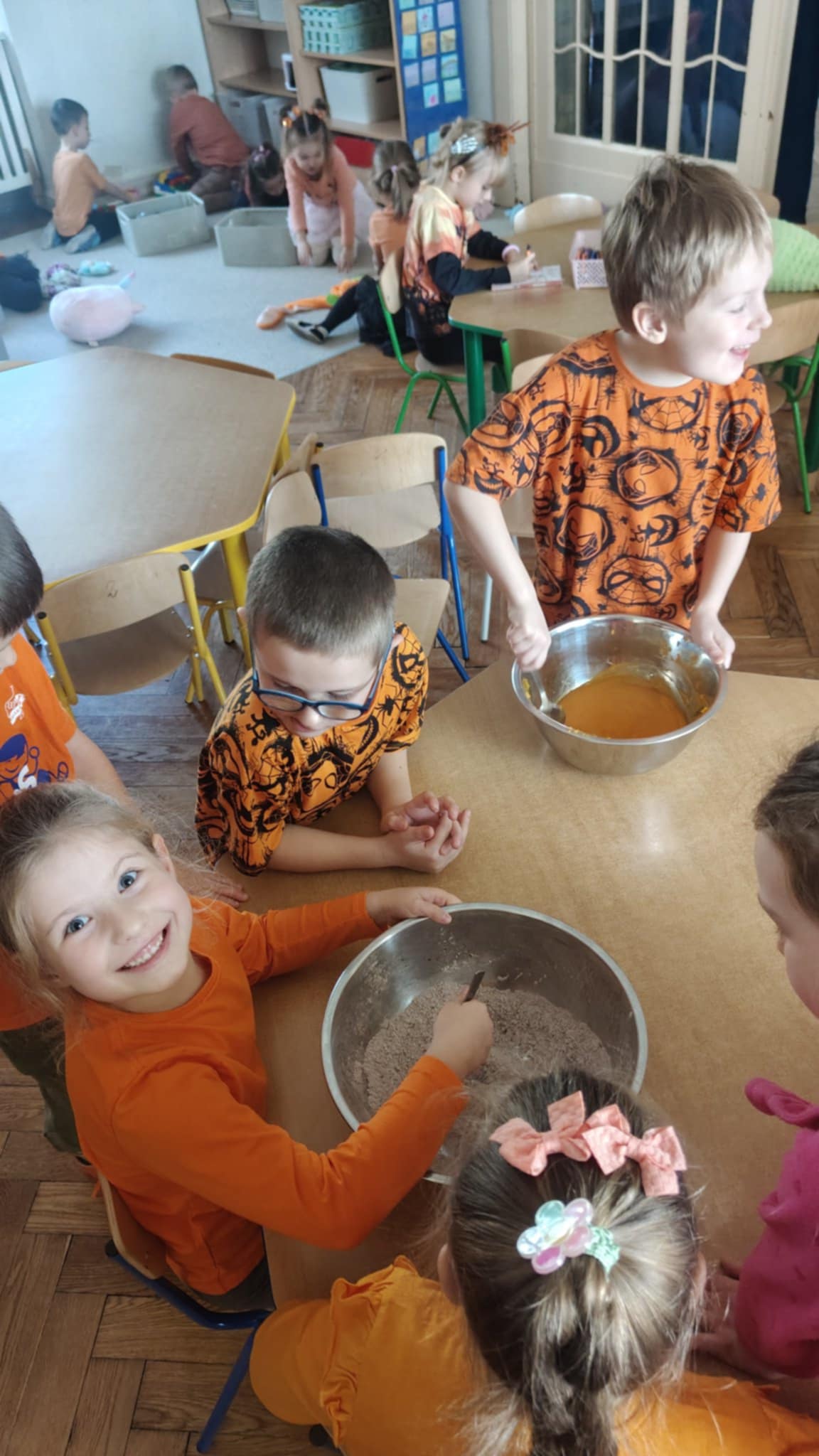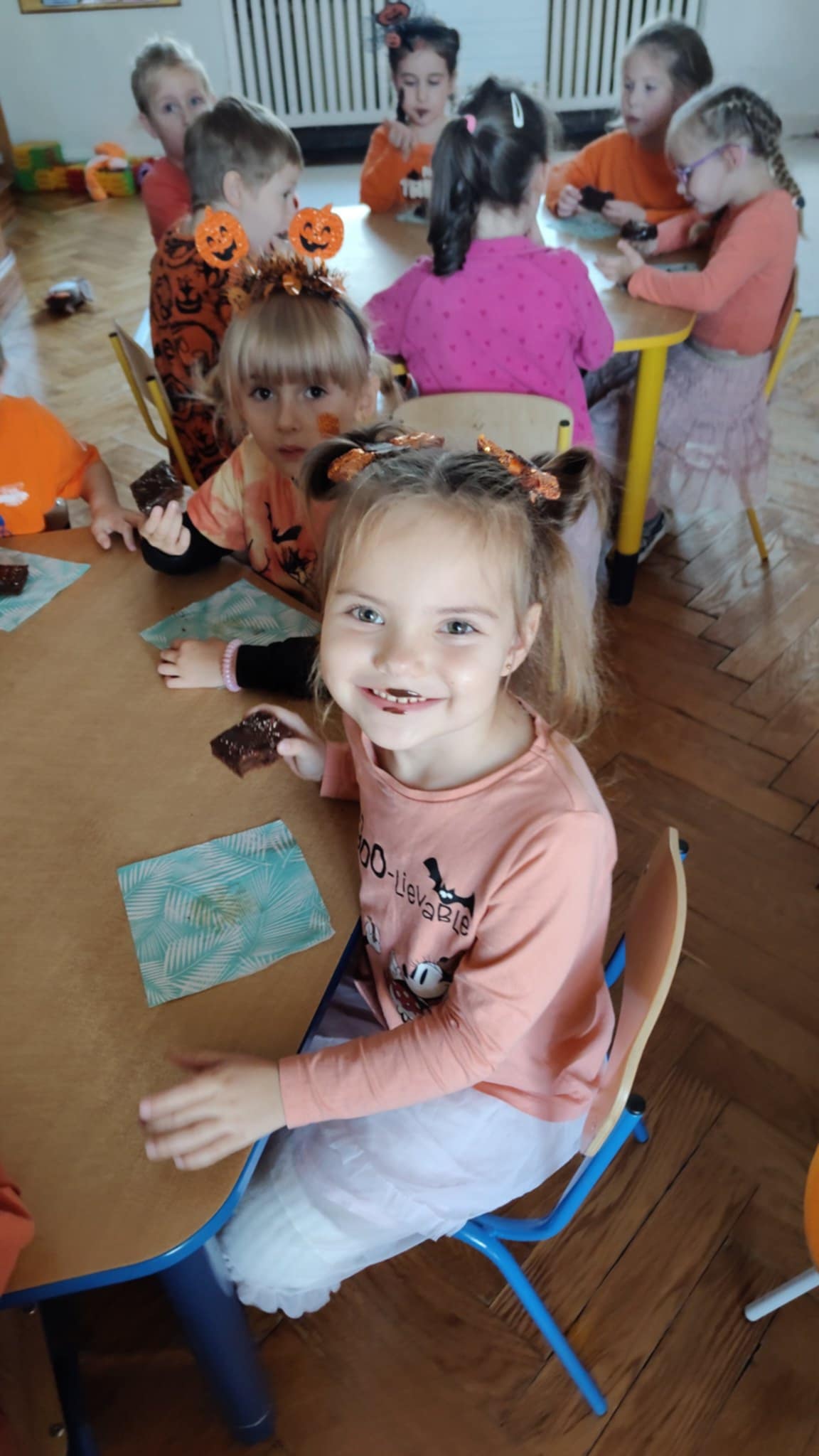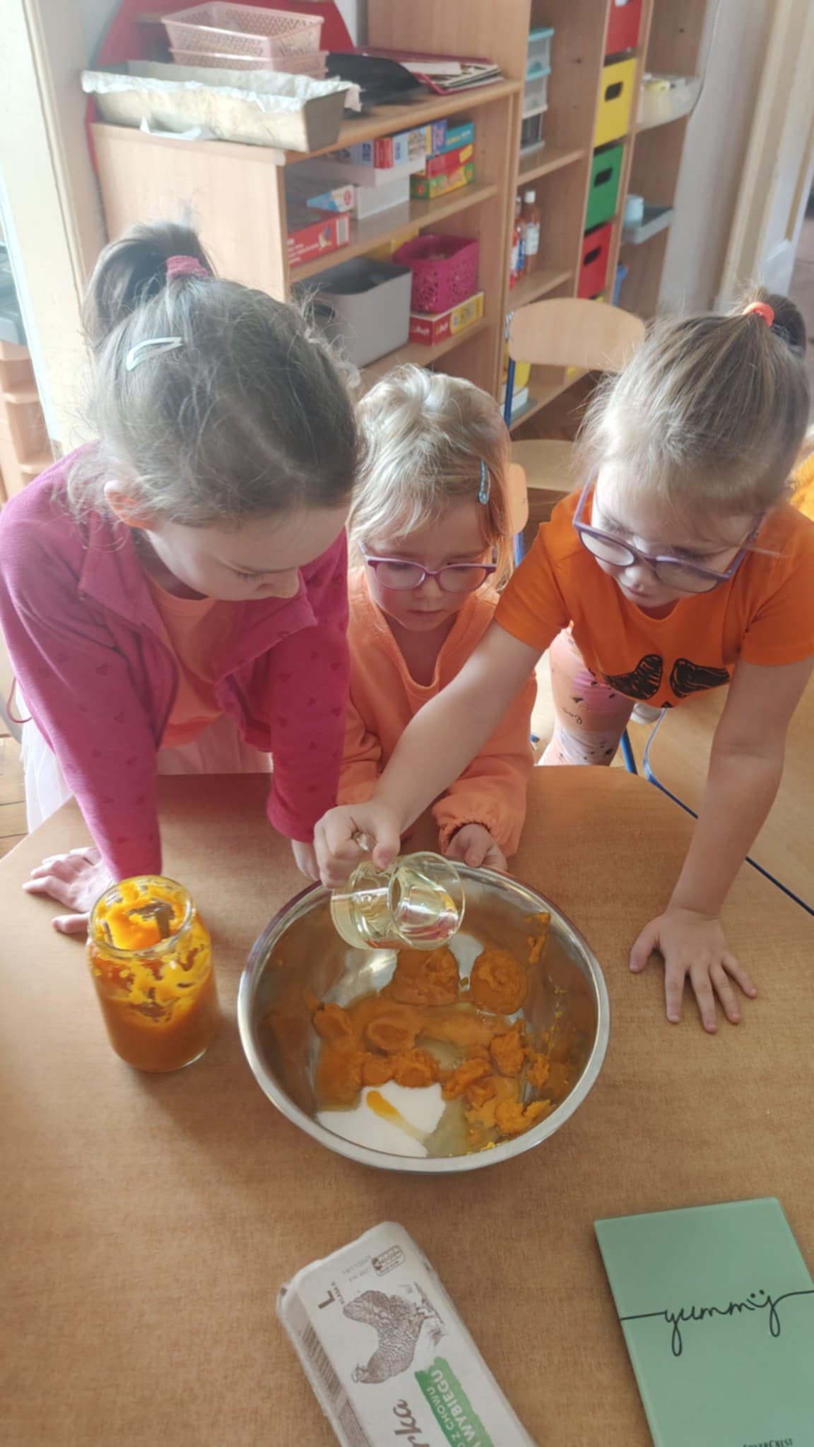 Dzieci poznały wielką różnorodność dyń i wzbogaciły wiedzę na ich temat. Dowiedziały się, że dynia jest bardzo zdrowym warzywem i że można z niej przygotować wiele dań tj.: pieczywo, zupę, dżem, ciasto, babeczki, przetwory i soki. Następnie przystąpiliśmy do dyniowych zabaw: klasyfikowania dyń wg wielkości, koloru i kształtu, szeregowanie od największej dyni do najmniejszej, przeliczania dyń, odczytywania dyniowych sylab, gry w domino i wiele innych. Wśród zabaw ruchowych były dyniowe kręgle, skoki przez różnej wielkości dynie, slalom dyniowy oraz zabawy taneczne. Na zakończenie dnia dyniowego dzieci miały okazję przekonać się jak smakuje ciasto dyniowo - czekoladowe, które oczywiście same zrobiły.