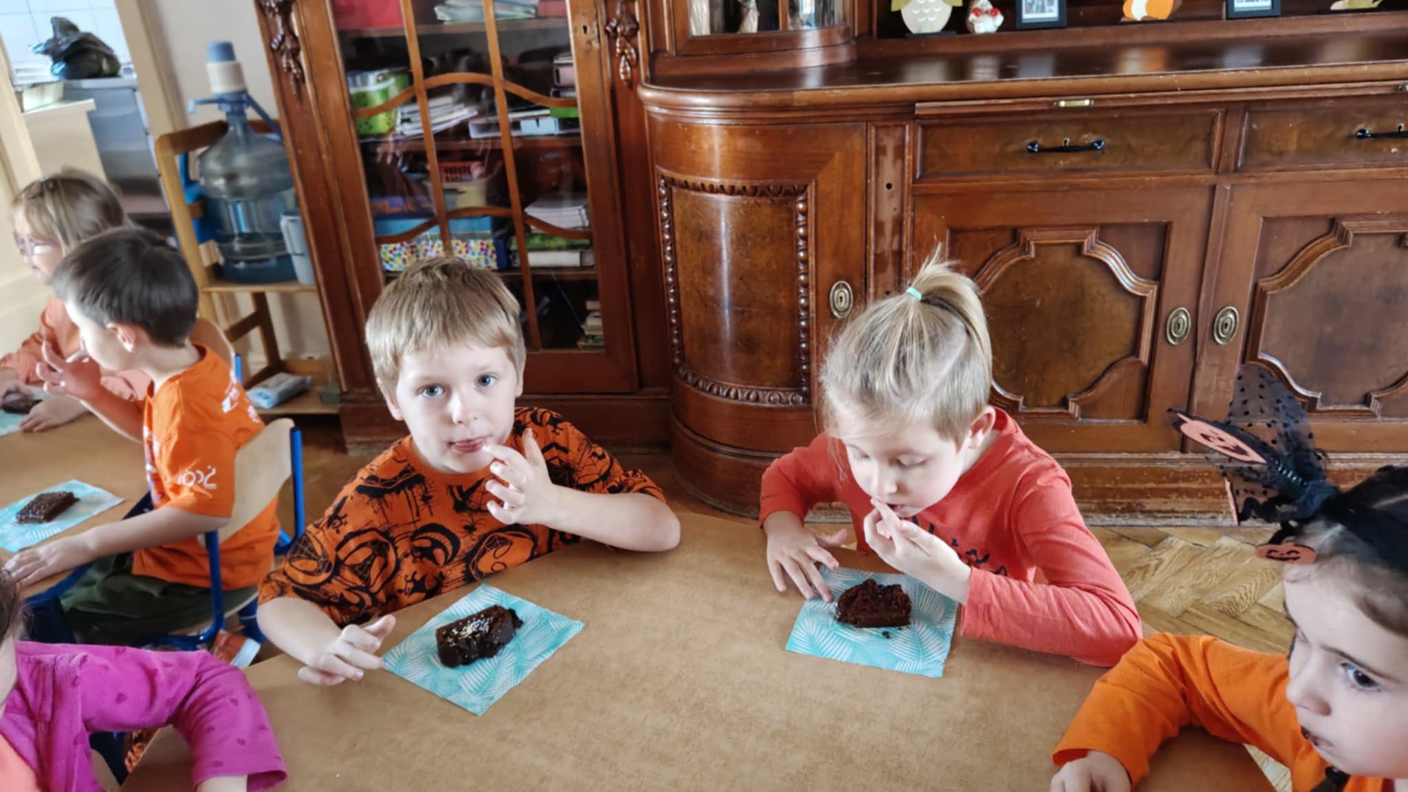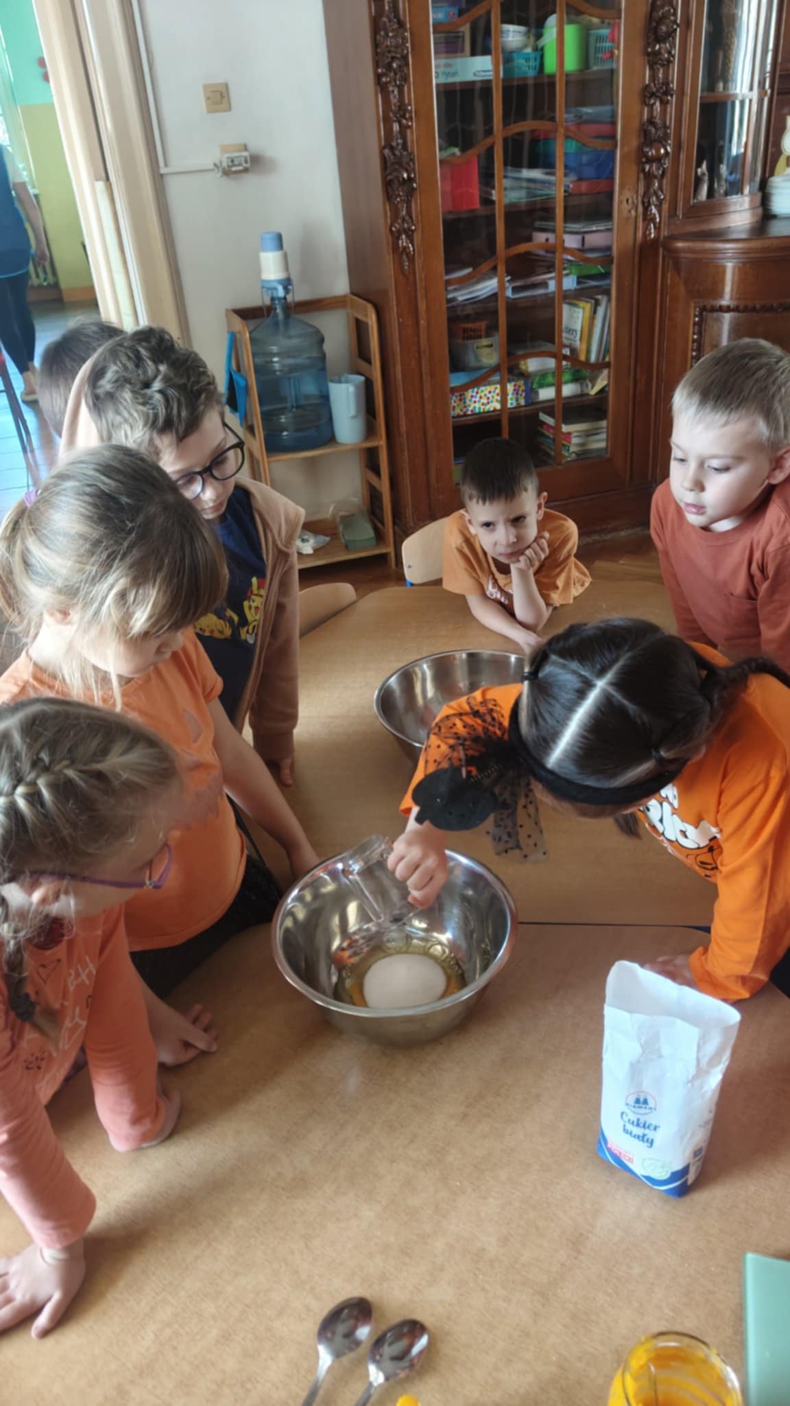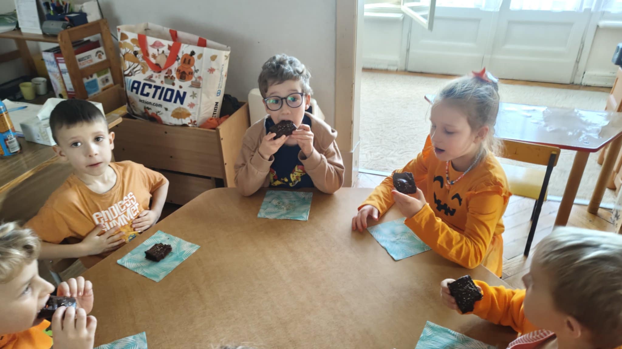 Dzieci poznały wielką różnorodność dyń i wzbogaciły wiedzę na ich temat. Dowiedziały się, że dynia jest bardzo zdrowym warzywem i że można z niej przygotować wiele dań tj.: pieczywo, zupę, dżem, ciasto, babeczki, przetwory i soki. Następnie przystąpiliśmy do dyniowych zabaw: klasyfikowania dyń wg wielkości, koloru i kształtu, szeregowanie od największej dyni do najmniejszej, przeliczania dyń, odczytywania dyniowych sylab, gry w domino i wiele innych. Wśród zabaw ruchowych były dyniowe kręgle, skoki przez różnej wielkości dynie, slalom dyniowy oraz zabawy taneczne. Na zakończenie dnia dyniowego dzieci miały okazję przekonać się jak smakuje ciasto dyniowo - czekoladowe, które oczywiście same zrobiły.