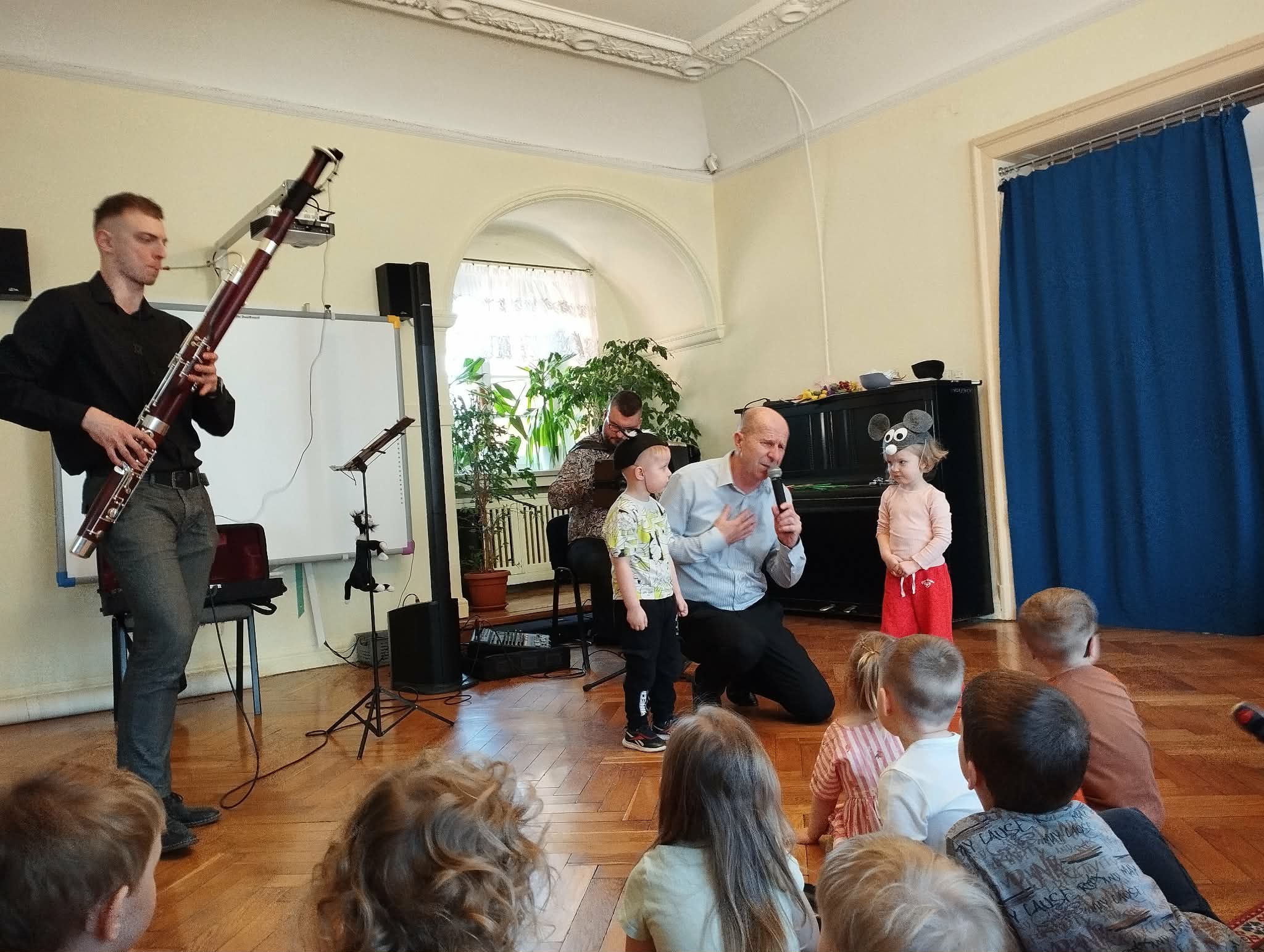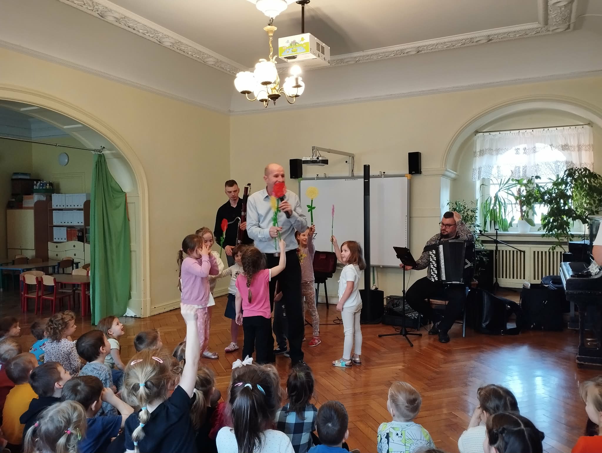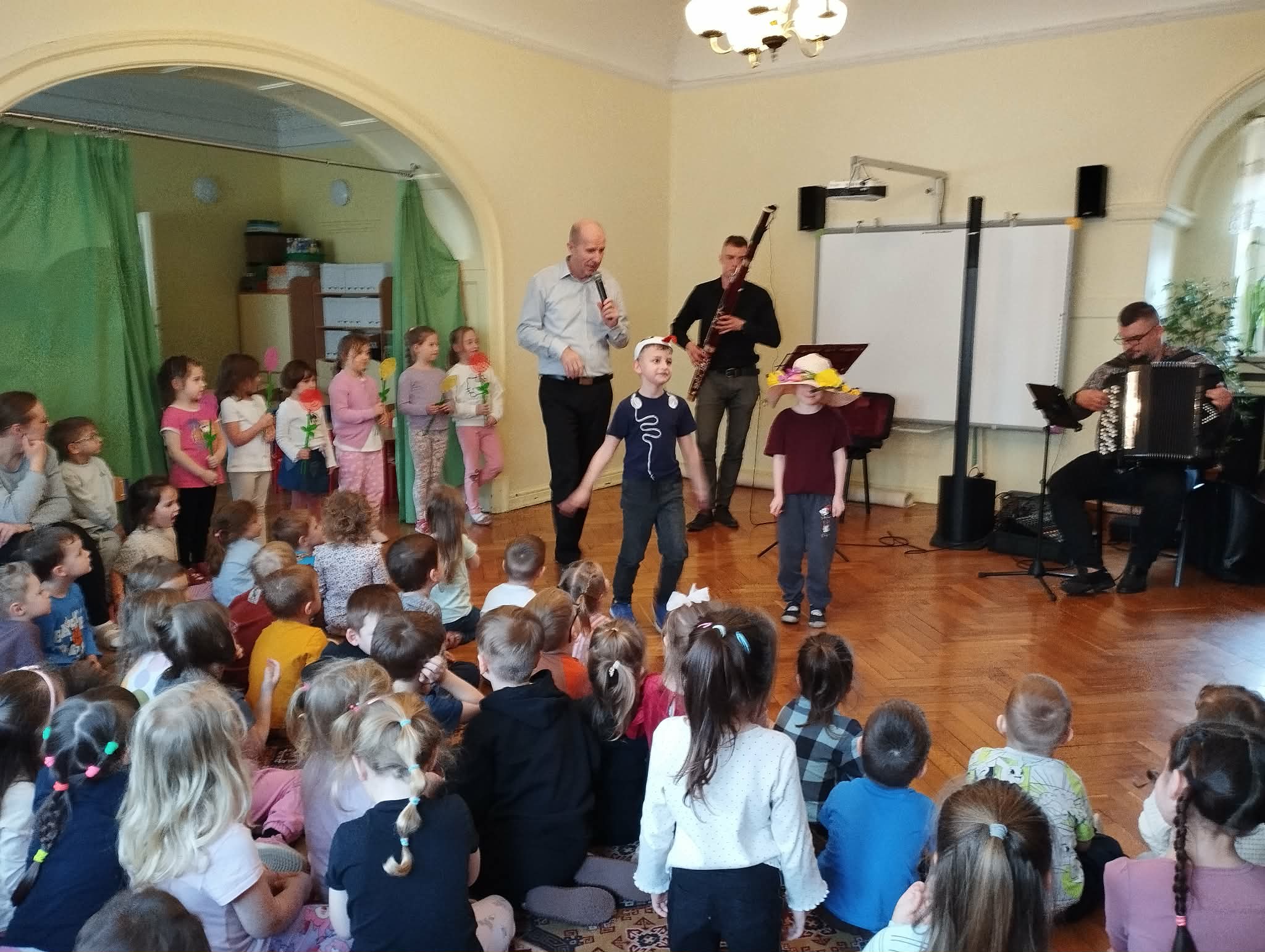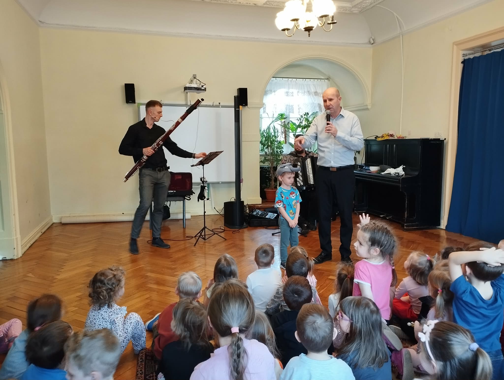 Po raz kolejny Filharmonia na kółkach odwiedziła nasze przedszkole tym razem z koncertem „Marcowa ballada o fagocie”. Podczas spotkania dzieci poznały fagot — instrument o ciepłym i niezwykle ciekawym brzmieniu — oraz jego budowę, a także wysłuchały muzyki na żywo. Grający na nim pan Szymon dostarczał słuchaczom mnóstwo emocji. W wiosenny nastrój wprowadziły wszystkich: Pani Wiosna, kwiaty oraz bocian — zwiastuny nadchodzącej wiosny. Mali słuchacze aktywnie uczestniczyli w wydarzeniu i byli bardzo zadowoleni. Już nie możemy się doczekać kolejnego spotkania.