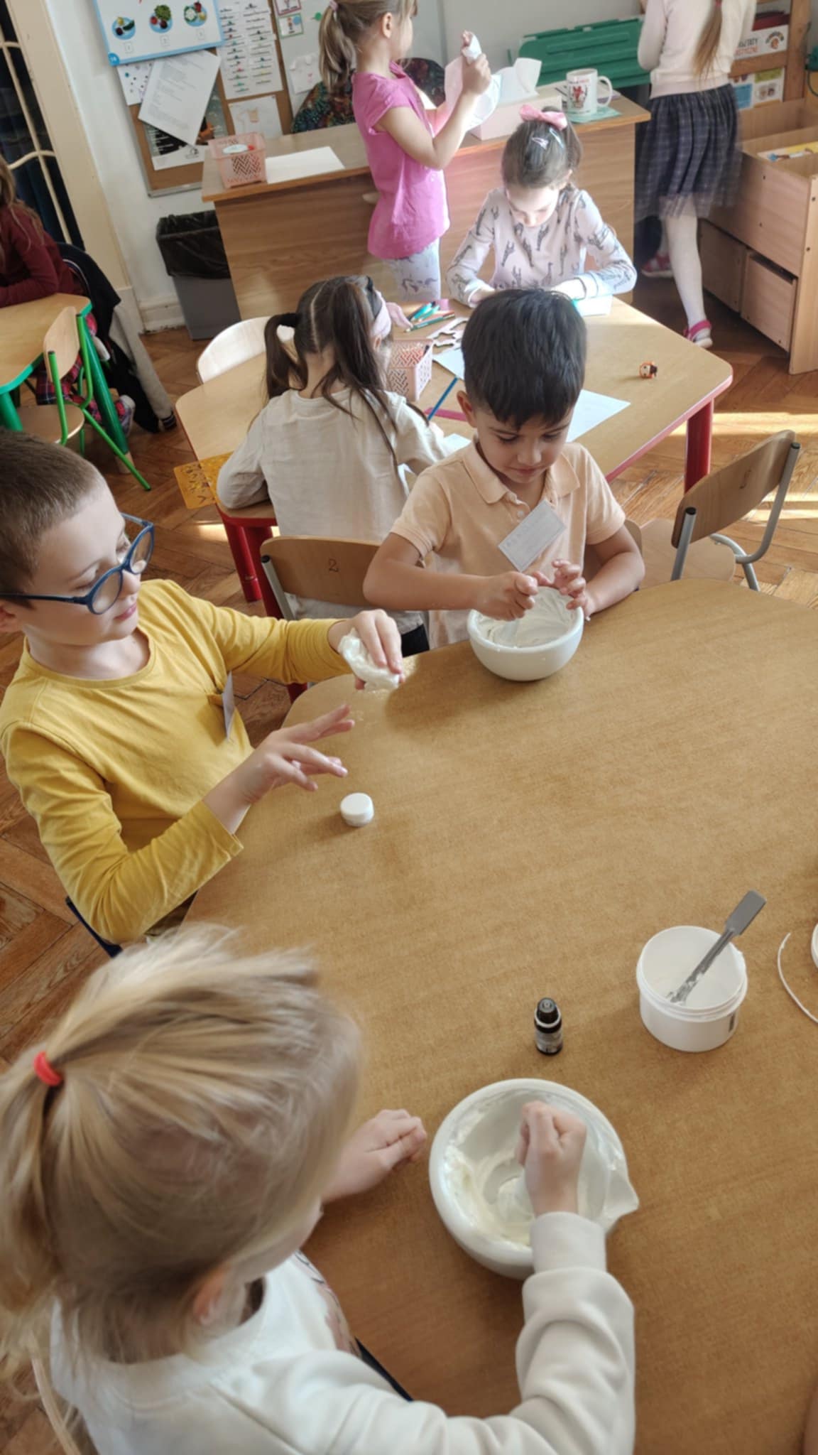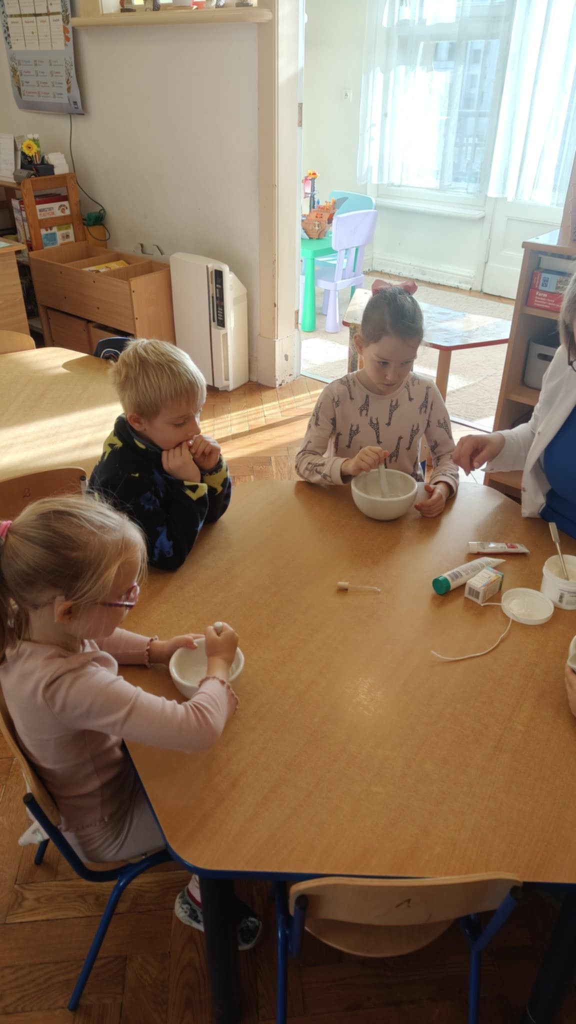 Następnie Pani Agata przybliżyła przedszkolakom zawód farmaceuty i charakter pracy w aptece. Opowiedziała o asortymencie apteki, o przeznaczeniu różnych farmaceutycznych przyborów, a także wytłumaczyła dzieciom, czym jest lek i jakie jego postacie można otrzymać w aptece. Podkreśliła, że leki można przyjmować tylko jeśli jest się chorym i pod opieką dorosłych. Pani Agata opowiedziała także o preparatach witaminowych dostępnych w aptece, a także zwróciła uwagę na fakt, że urozmaicona dieta bogata w owoce i warzywa zapewnia nam wystarczającą ilość witamin. Podczas spotkania przedszkolaki dowiedziały się także jak wygląda i do czego służy recepta. Interesującym doświadczeniem było wykonywanie maści recepturowej. Dzieci z pomocą Pani Agaty z wielkim zaangażowaniem ucierały w moździerzu składniki potrzebne do jej zrobienia. Po wykonaniu maści pani farmaceutka przełożyła ją do pudełeczka, a następnie dzieci mogły ją zabrać do domu. To były bardzo interesujące i pouczające zajęcia. Jeszcze raz serdecznie dziękujemy Pani Agacie za przybliżenie jej pracy.